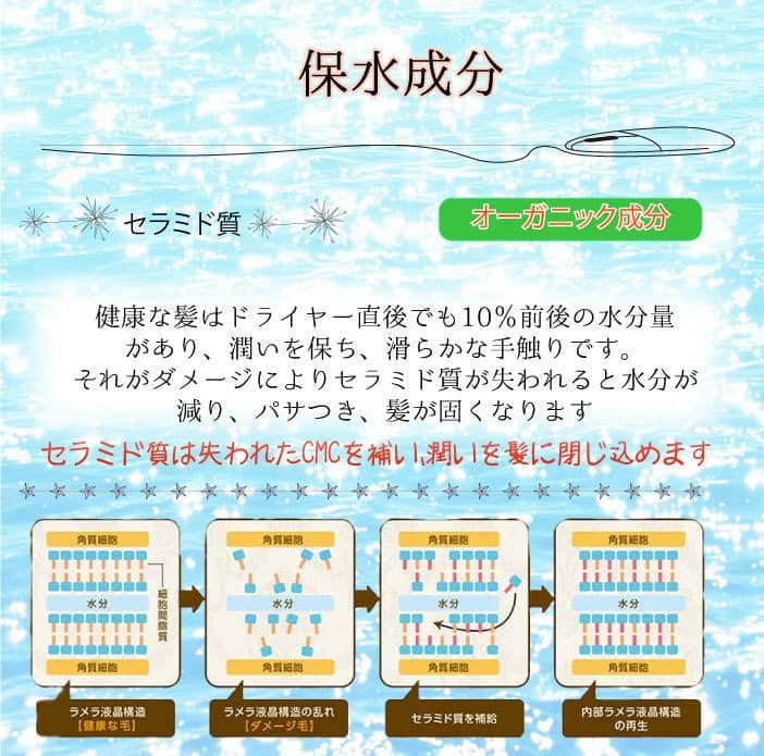 ●保水成分:健康な髪はドライヤー直後でも1 0 % 前後の水分量があり、潤いを保ち、滑らかな手触りです。それがダメージによりセラミド質が失われると水分が減り、パサつき、髪が固くなります。