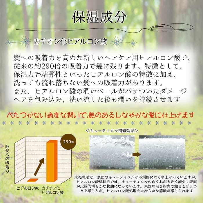 髪への吸着力を高めた新しいヘアケア用ヒアルロン酸で、従来の約2 9 0 倍の吸着力で髪に残ります。特徴として、保湿力や粘弾性といったヒアルロン酸の特徴に加え、洗っても流れ落ちない髪への吸着力があります。また、ヒアルロン酸の潤いベールがパサついたダメージヘアを包み込み、洗い流した後も潤いを持続させます。べたつかない適度な潤いで、艶のあるしなやかな髪に仕上げます