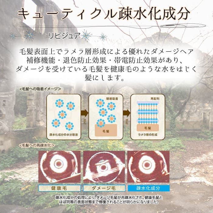 毛髪表面上でのラメラ層形成による優れたダメージヘア補修機能・褪色防止効果・帯電防止効果があり、ダメージを受けている毛髪を健康毛のような水を弾く髪にします