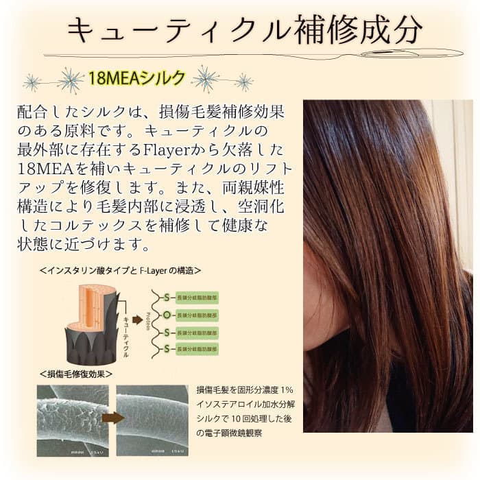 配合したシルクは、損傷毛髪補修効果のある原料です。キューティクルの最外部に存在するF−l a y e r から欠落した1 8 M E A を補い、キューティクルのリフトアップを修復します。また、両親媒性構造により毛髪内部に浸透し、空洞化したコルテックスを補修して健康な状態に近づけます