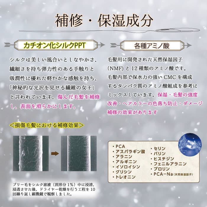 毛髪用に開発された天然保湿因子( N M F ) と1 2 種類のアミノ酸です。毛髪内部で保水力の強いC M C を構成するタンパク質のアミノ酸組成を参考にミックスしています。保湿・毛髪の強度改善・ヘアカラーの色落ち防止・ダメージ補修の効果があります