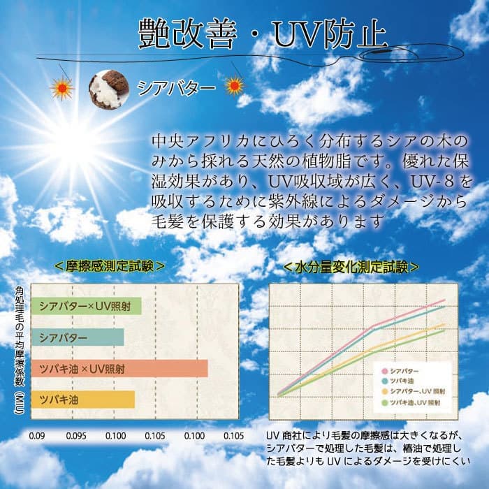 中央アフリカに広く分布するシアの木の実から採れる天然の植物脂です。優れた保湿効果があり、U V 吸収域が広く、U V−B を吸収するために紫外線によるダメージから毛髪を保護する効果があります