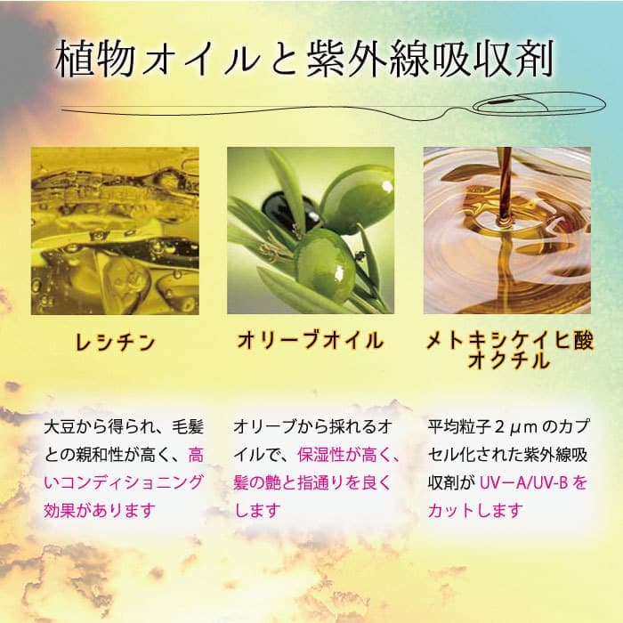 平均粒子2 ? のカプセル化された紫外線吸収剤がU V−A / U V ― B をカットします。誰もが安心してお使いでき、髪でもっと楽しめるように創りました
