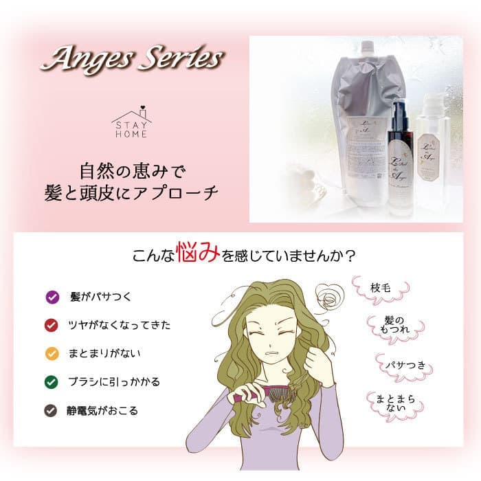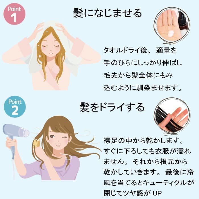 洗い流さないトリートメント ダメージヘアやドライヘアのコルテックス内部とキューティクルのβ-レイヤーに保水力(CMC)を加え水分量の低下を防ぎ、さらに天然の潤いベールと疎水化成分がキューティクル表面を包み込み、しなやかで落ち着いた手触りの良い髪に仕上げると共に、ダメージや紫外線から髪を守ります。