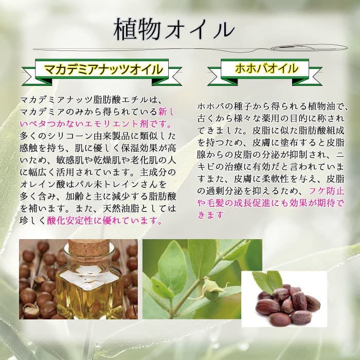 ホホバの種子から得られる植物油で、古くから様々なな薬用の目的に使用されてきました。皮脂に似た脂肪酸組成をもつため、皮膚に塗布すると皮脂腺からの皮脂の分泌が抑制され、ニキビの治療に有効だと言われています。また、皮膚に柔軟性を与え、皮脂の過剰分泌を抑えるため、フケ防止や毛髪の成長促進にも効果が期待できます