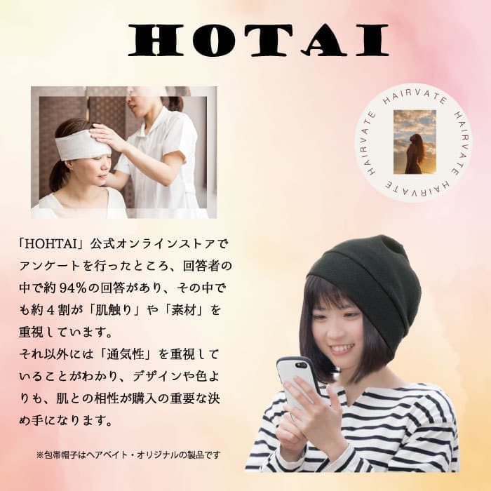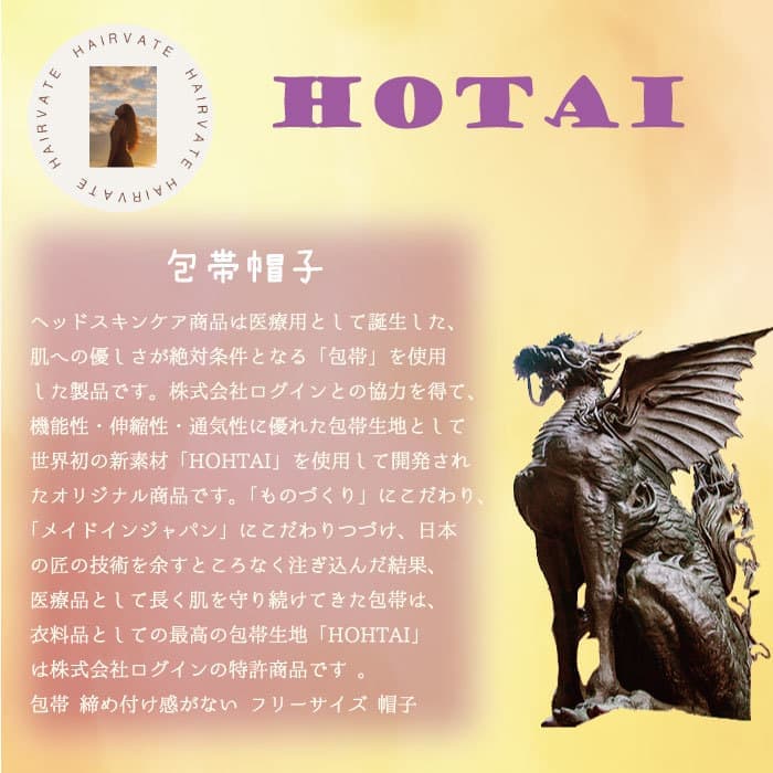 (株)ログインとの協力を得て、機能性・伸縮性・通気性に優れた包帯生地として世界初の新素材「HOHTAI」を使用して開発されたオリジナル商品です。「ものづくり」にこだわり、「メイドインジャパン」にこだわりつづけ、日本の匠の技術を余すところなく注ぎ込んだ結果、医療品として長く肌を守り続けてきた包帯は、衣料品としての最高の包帯生地「HOHTAI」は(株)ログインの特許商品です包帯帽子は医療用として誕生した、肌への優しさが絶対条件となる「包帯」を使用した帽子です。夏は通気性がよく、冬は保温性に優れています。ゴムを一切使用していないので締め付けがなく、違和感なく使用していただけます